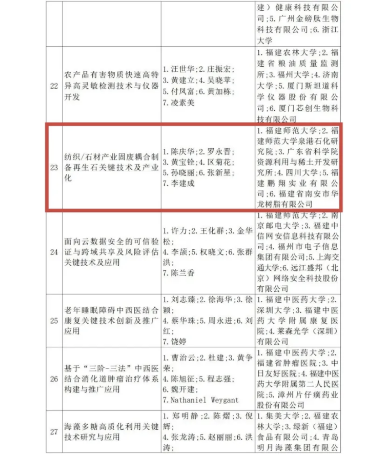 近日,福建省人民政府公布了关于2024年度省科学技术奖励的决定(闽政文[2025]263号),我院陈庆华教授领衔的“纺织/石材产业固废耦合制备再生石关键技术及产业化”项目喜获2024年度福建省科学技术进步奖二等奖。该奖励成果由我校牵头,联合四川大学、福建鹏翔实业有限公司等六家单位共同完成,是我院在科学技术成果奖励方面的重大成果。